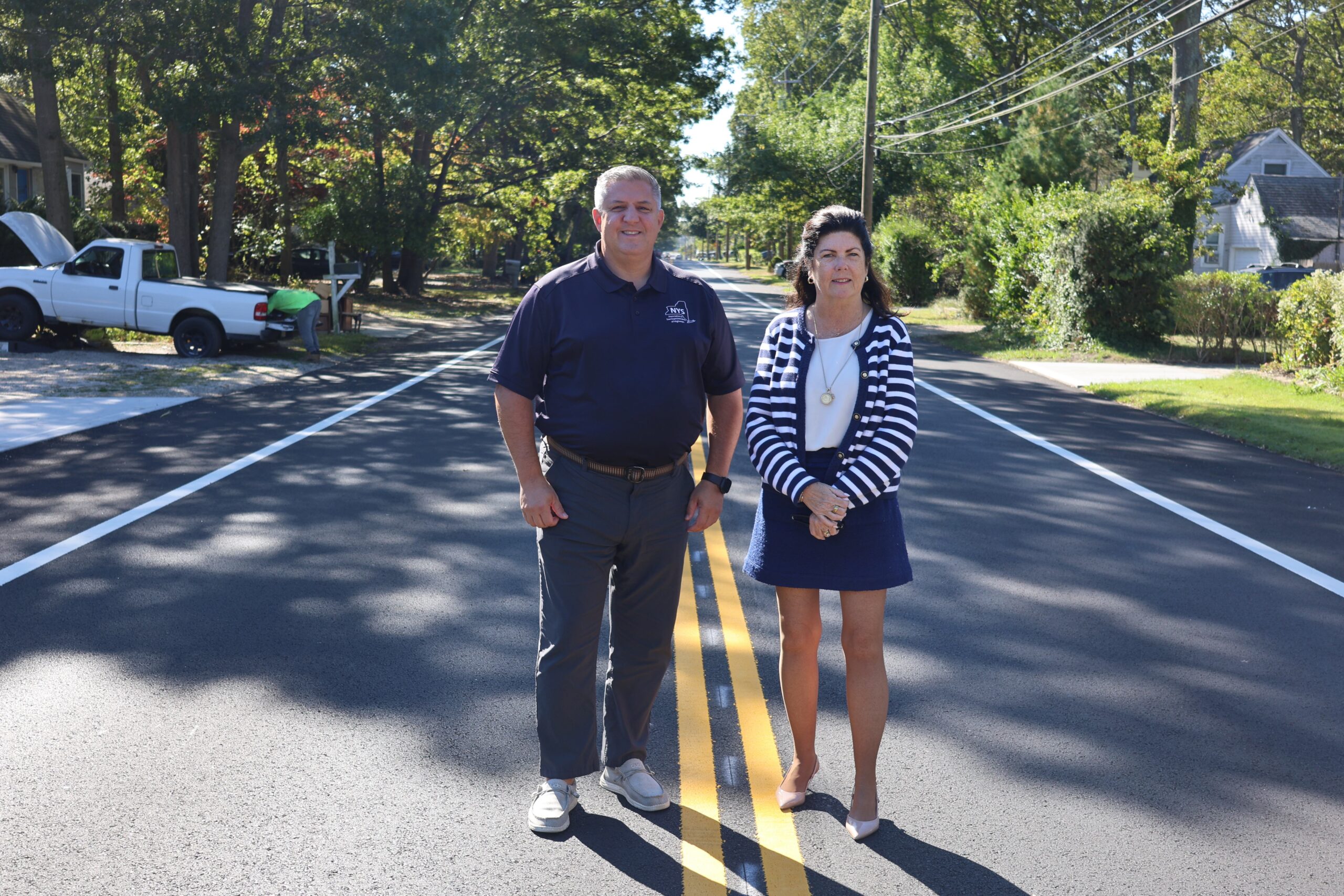 Caption: Superintendent Losquadro and Councilwoman Dunne Kesnig on Madison Street in Mastic.